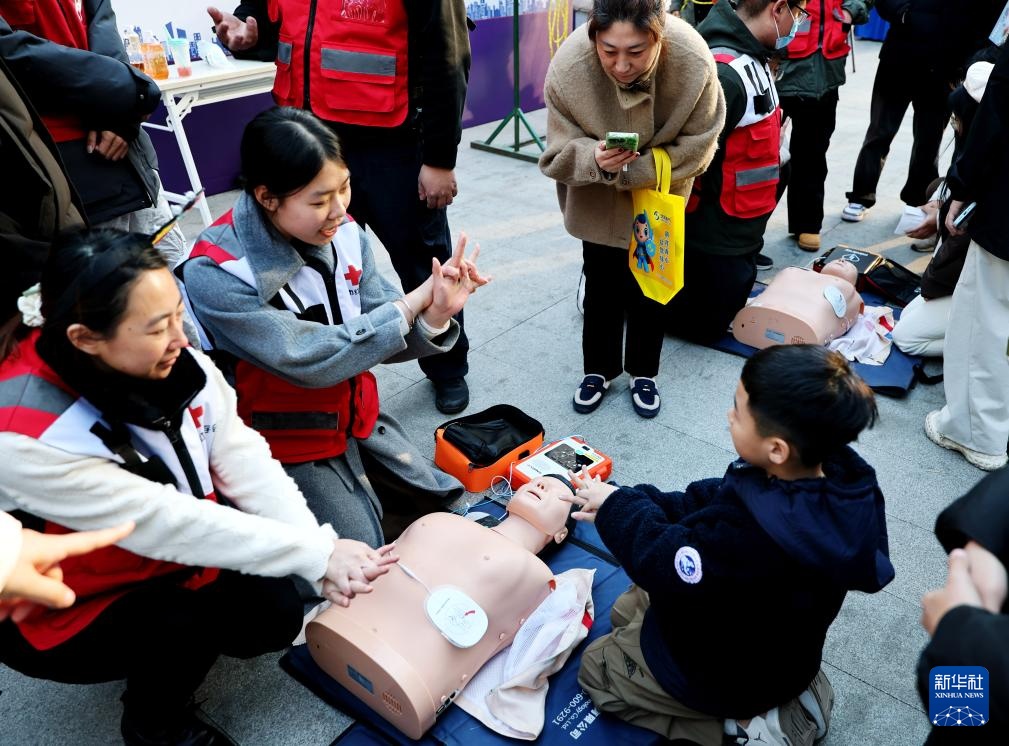 11月9日,在沈阳市中街商业步行街,红十字会工作人员讲授心肺复苏急救知识。