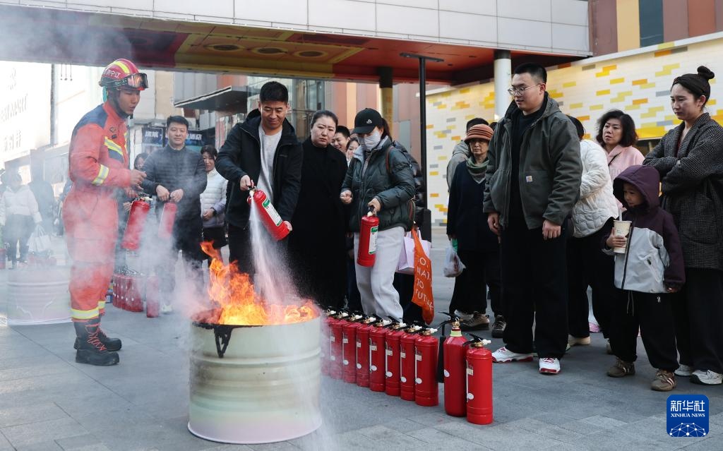 11月9日,在沈阳市中街商业步行街,市民参加灭火演练。