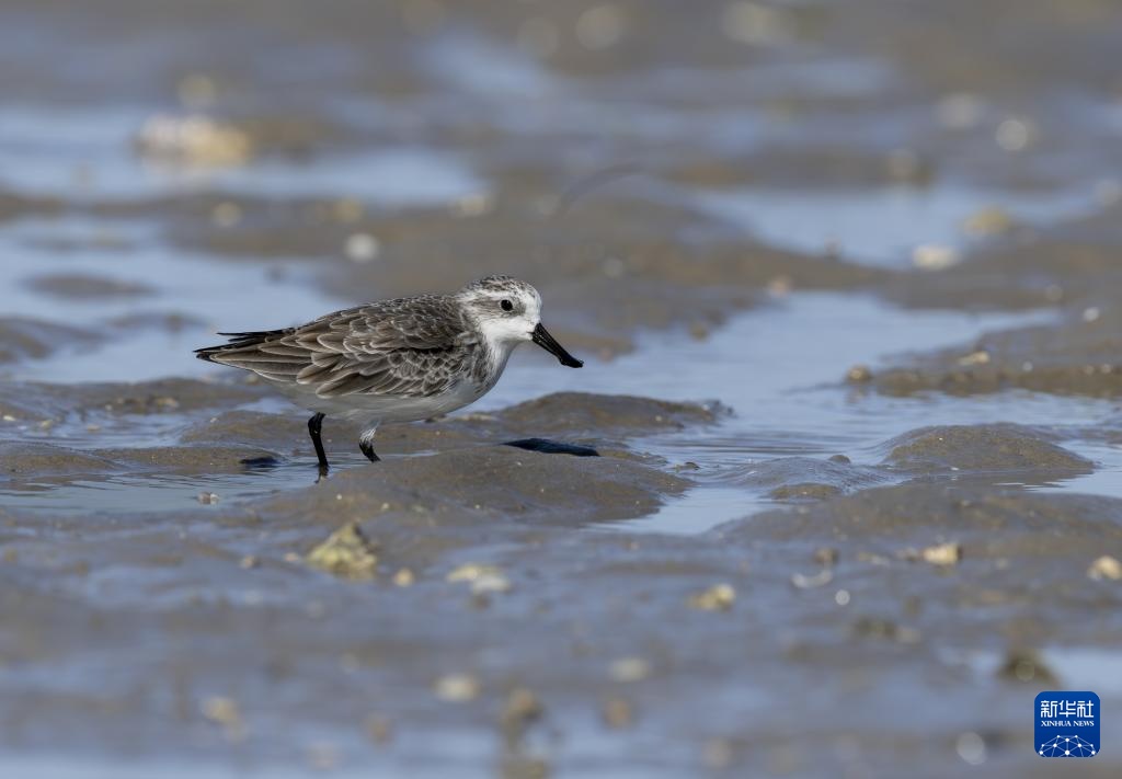 11月9日,一只勺嘴鹬在泉州围头湾滩涂上捕食海虾。