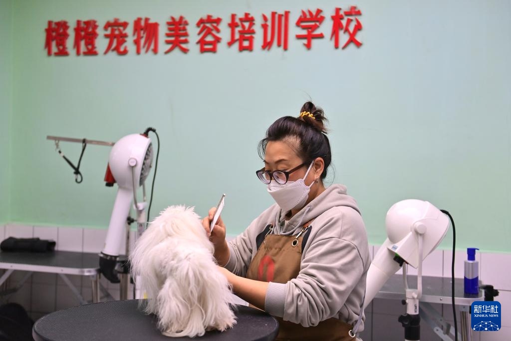 11月7日,在鞍山市铁西区一家宠物销售公司开设的宠物美容培训学校,工作人员在梳理宠物狗毛发。
