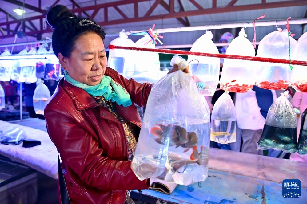 4月10日,在鞍山三台子观赏鱼交易中心,一名商户展示自家售卖的观赏鱼。