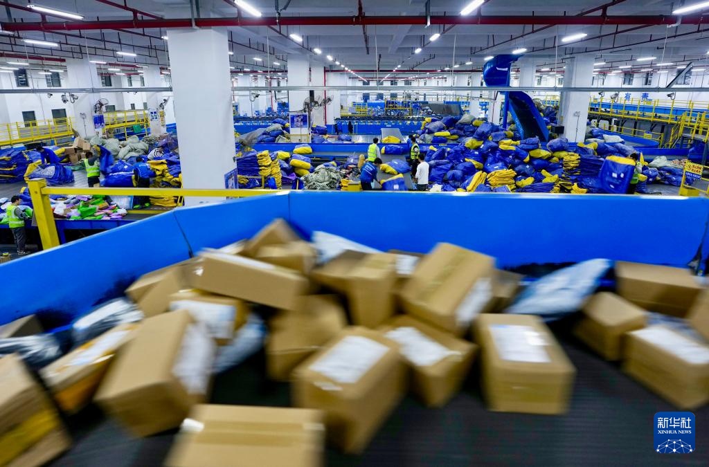11月11日,在位于宁夏银川市贺兰县的中通快递宁夏管理中心内,工作人员分拣快递。