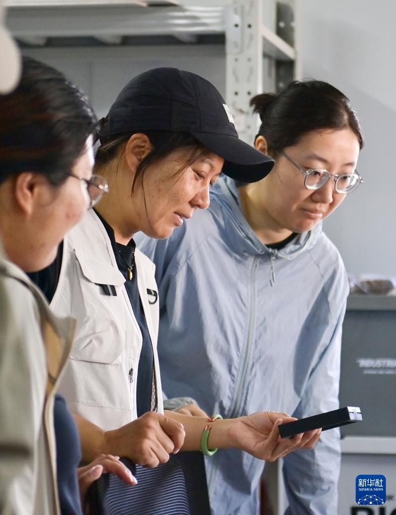 9月28日,于怀石(中)和同事在位于辽宁朝阳的牛河梁工作站内查看出土的文物。