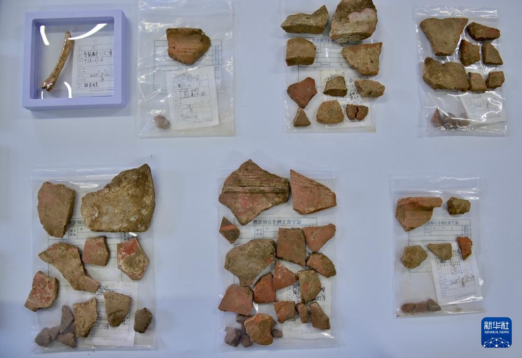 9月28日在位于辽宁朝阳的牛河梁工作站内拍摄的陶片和骨骸残件。