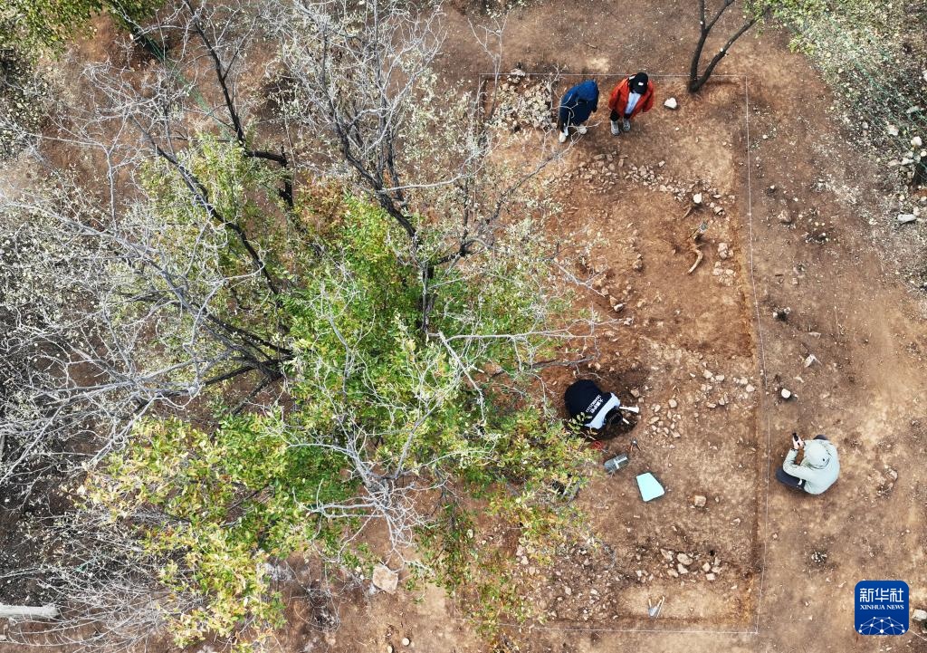10月24日,于怀石(上右)和同事在位于辽宁朝阳的牛河梁遗址第十三地点工作(无人机照片)。