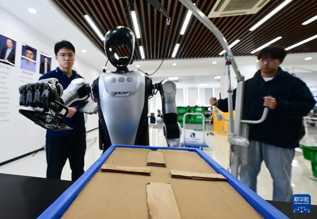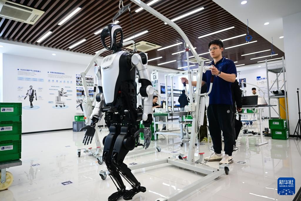 10月24日,张鸿伟操控人形机器人,准备进行测试。新华社记者 杜潇逸 摄