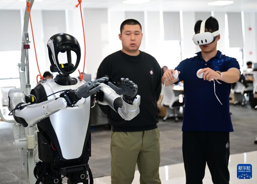 10月24日,张鸿伟(右)在同事的指导下使用VR设备进行机器人遥操作,用于动作捕获采集数据。新华社记者 周牧 摄