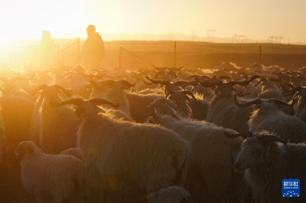 11月13日,在青海省海北藏族自治州刚察县泉吉乡宁夏村草场,牧民将羊群赶回羊圈。