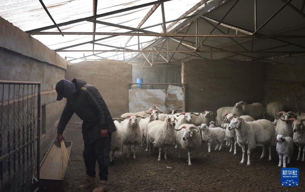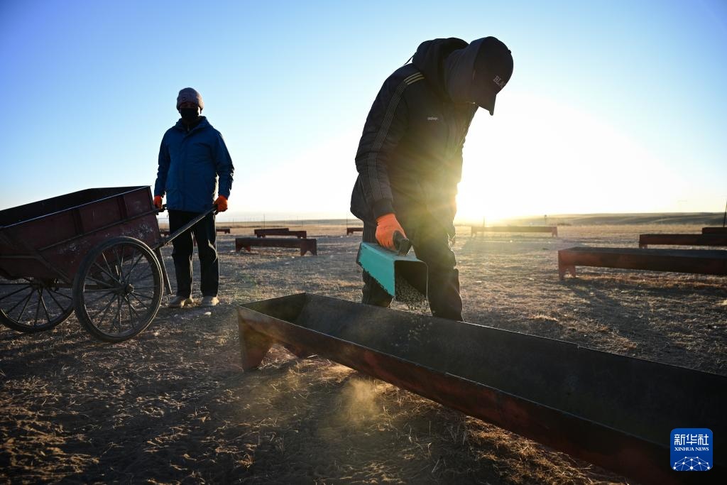 11月13日,在青海省海北藏族自治州刚察县泉吉乡宁夏村草场,牧民拉保(右)在为羊群补饲。