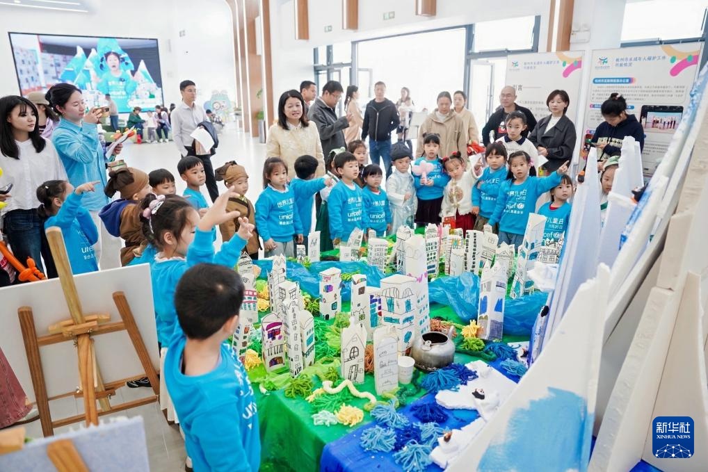 11月15日,在杭州市富阳区,孩子们在“儿童友好,让杭城更美好”主题活动中介绍自己制作的环保主题作品。