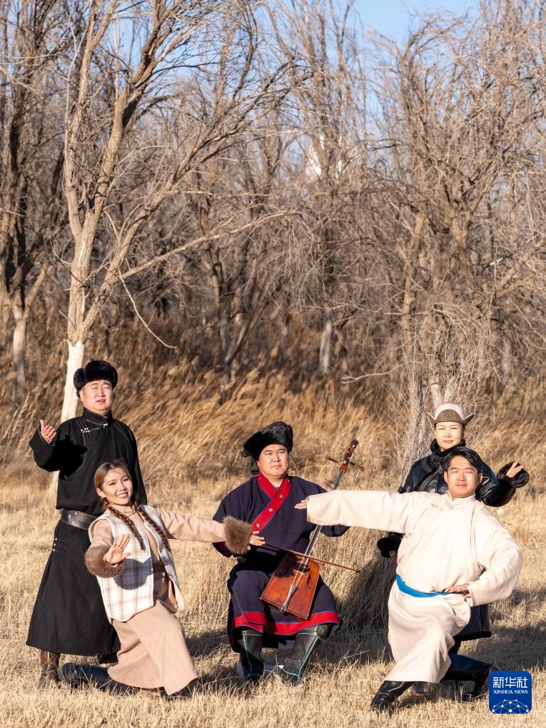 11月13日,在苏尼特右旗,乌兰牧骑的演员们在户外排练。