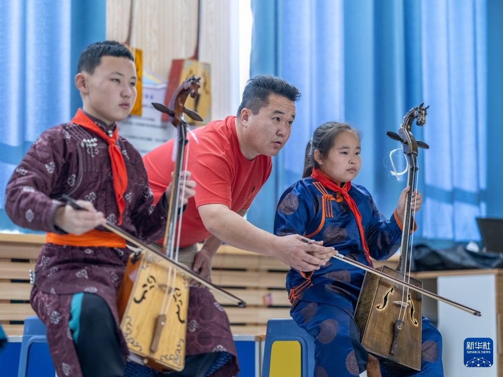 11月13日,在苏尼特右旗第五小学,乌云吉日嘎拉在指导孩子们演奏马头琴。
