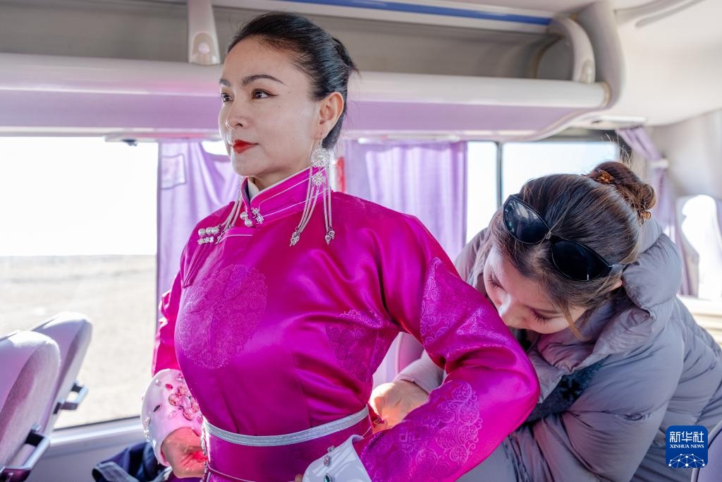 11月12日,乌兰牧骑的演员在下乡演出的大巴车上更换服装。