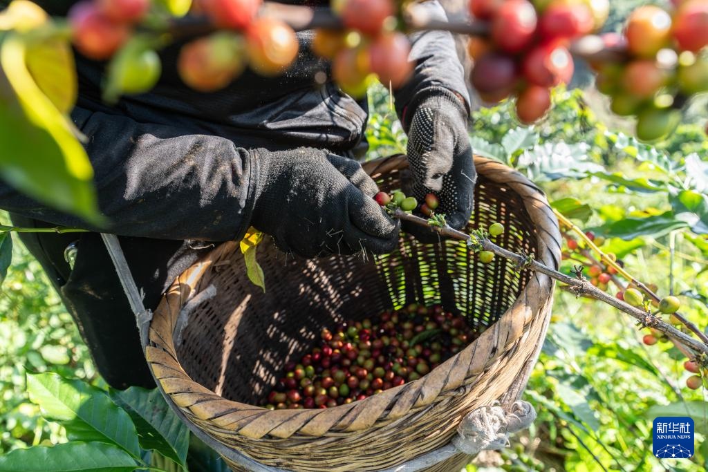 11月16日,咖农在云南省保山市隆阳区新寨村的一处咖啡园内采摘咖啡果。