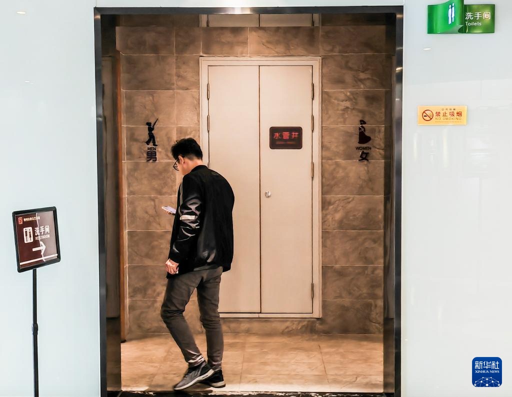 11月6日,在广西柳州市群众艺术馆,参观者走入公共卫生间。该卫生间标识用民族服饰展示文化特色,中英文文字提供准确信息。