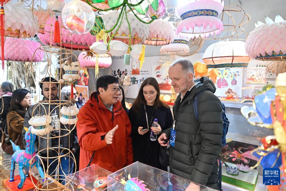 11月20日,在位于南京小西湖街区的工作室,秦淮灯彩艺人、国家级非物质文化遗产代表性传承人顾业亮(右三)向嘉宾介绍秦淮灯彩。