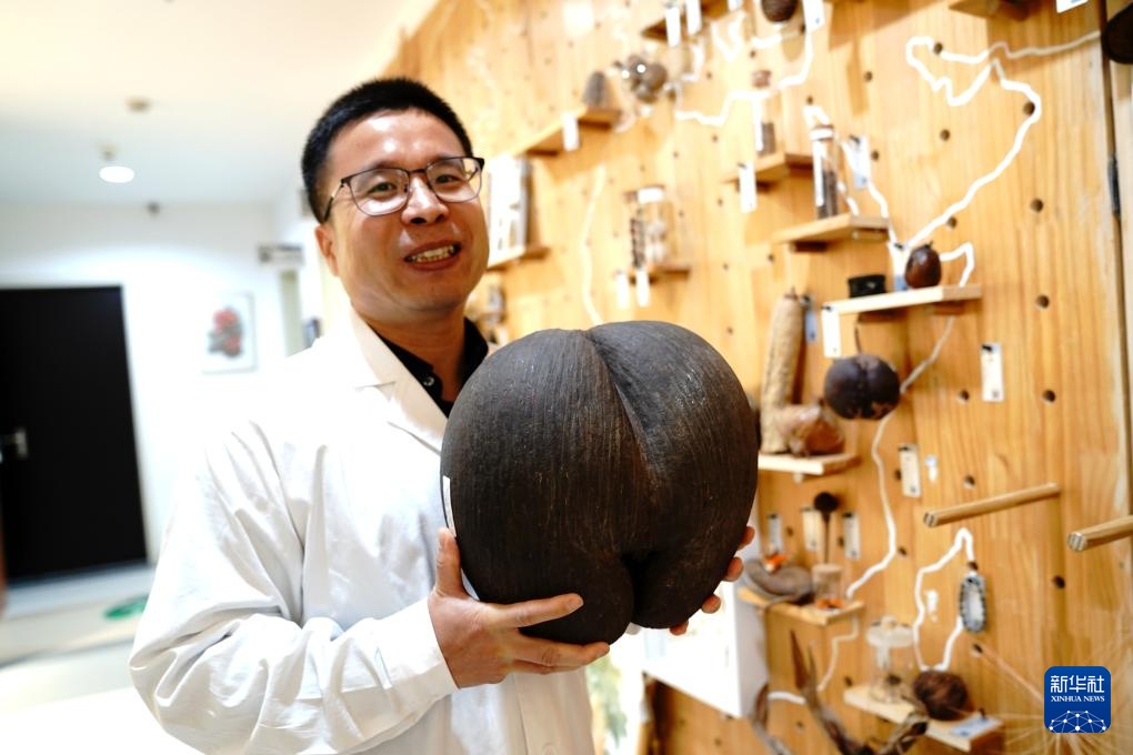 11月19日,上海辰山植物标本馆馆长葛斌杰展示世界最大的植物种子——巨子棕的种子。
