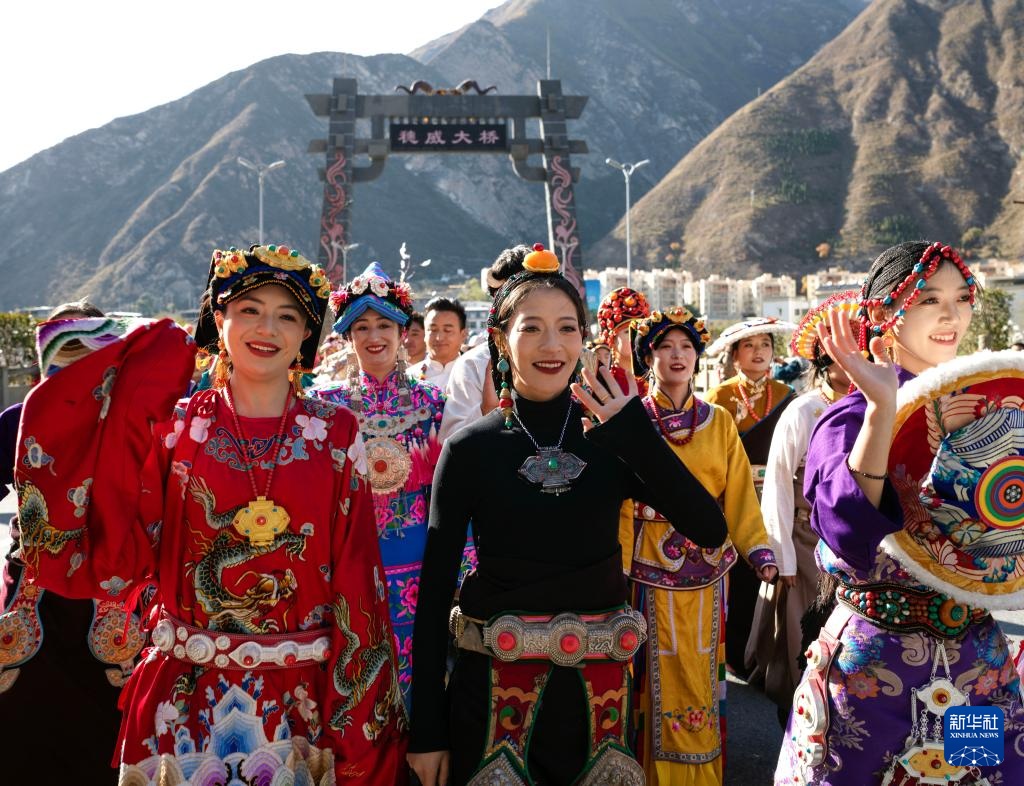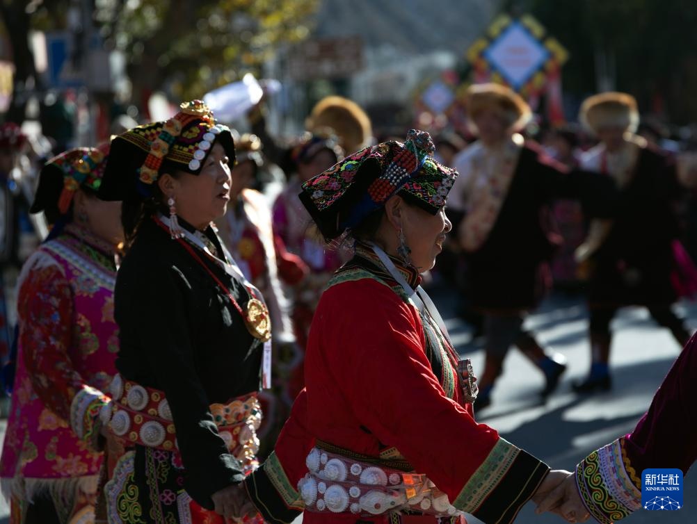 11月19日,在四川省汶川县城,身着民族服饰的妇女参加非遗大巡游活动。