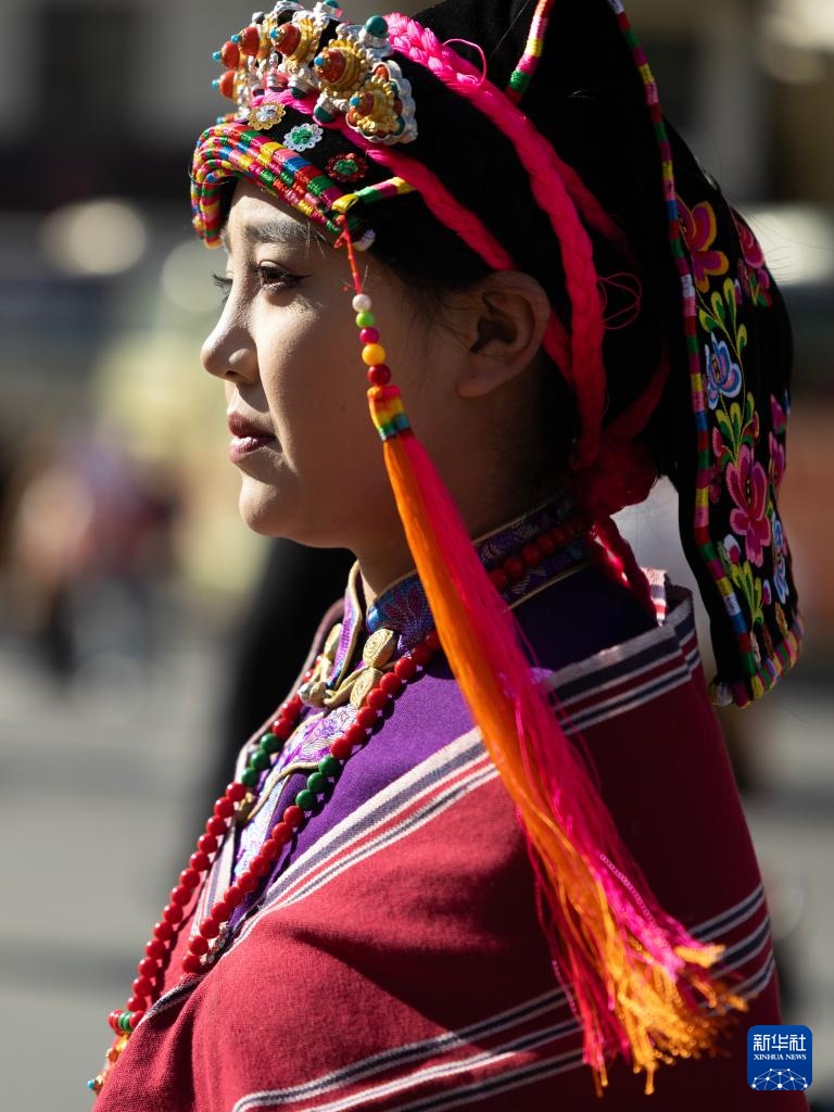 11月19日,在四川省汶川县城,一名身着民族服饰的姑娘参加非遗大巡游活动。