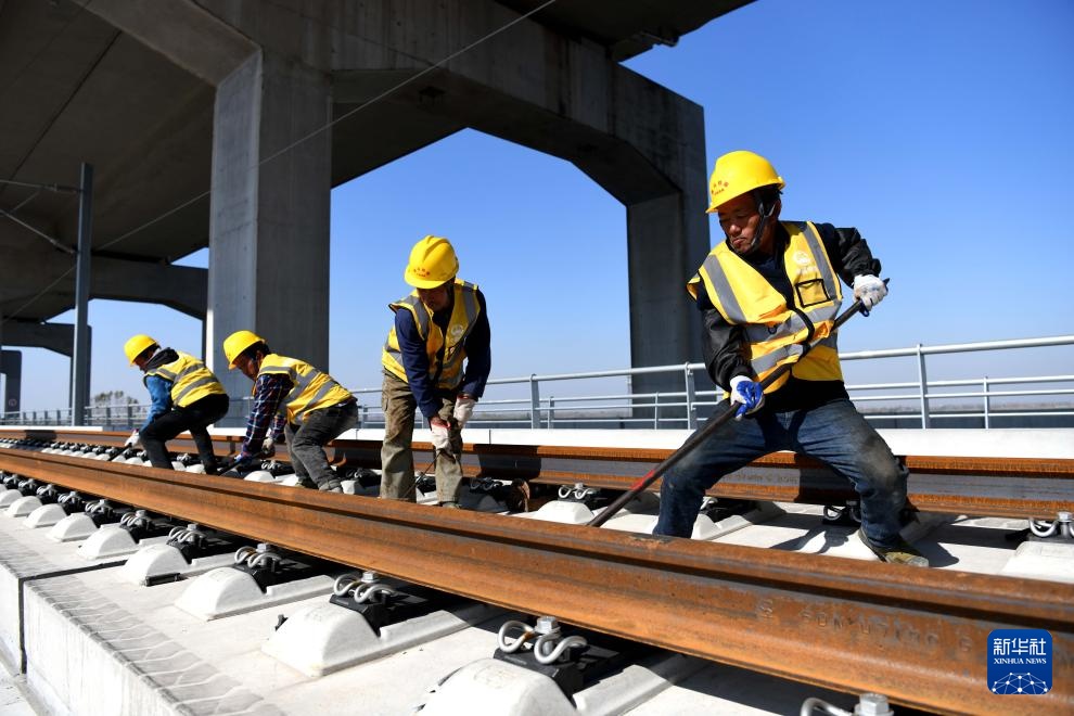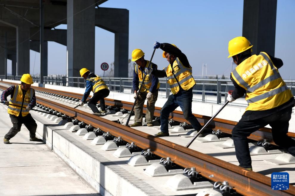 11月20日,中铁四局施工人员在巢马城际铁路铺轨施工现场作业。