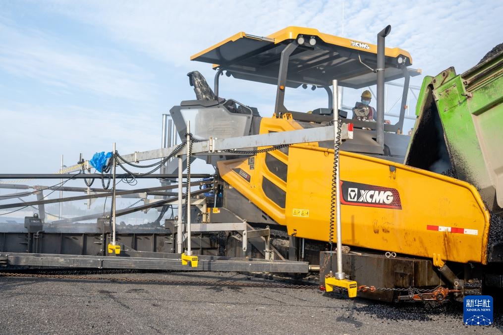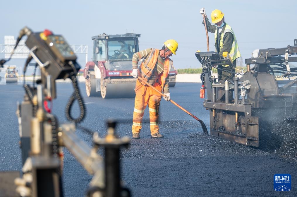 11月20日,中铁十一局工人在京港澳高速湖北北段改扩建孝南互通枢纽铺沥青。