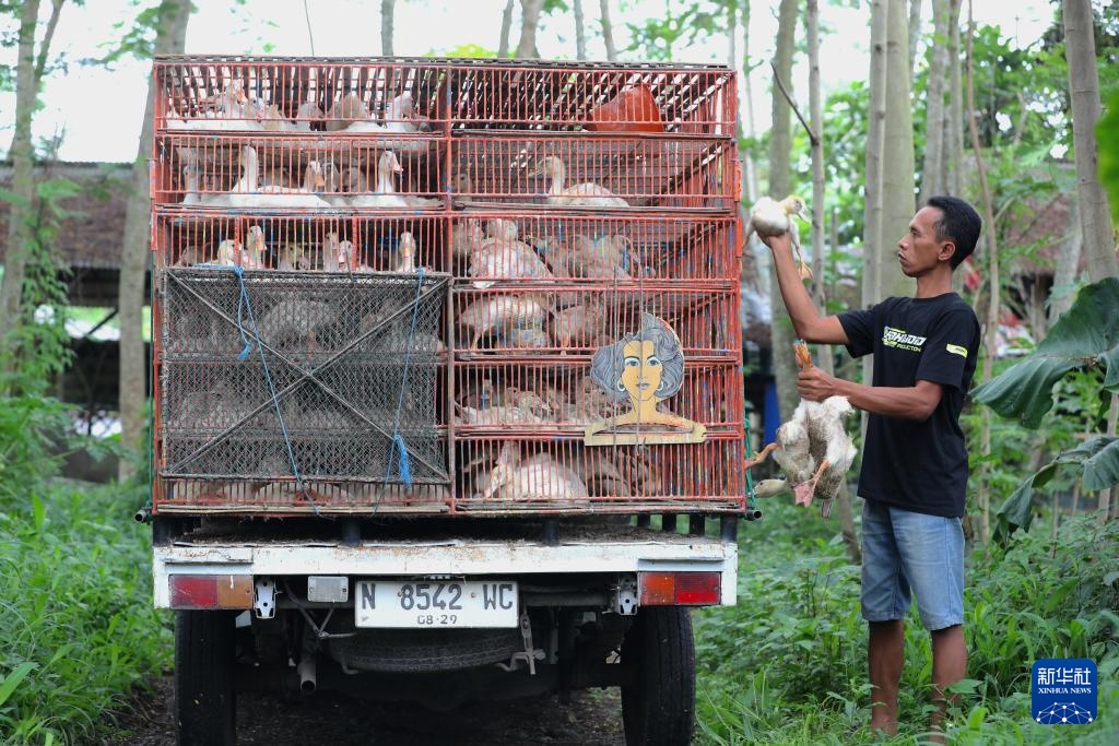 11月13日,在印度尼西亚东爪哇省布尔沃索诺村,工作人员将从养殖户手里收来的鸭子装车。