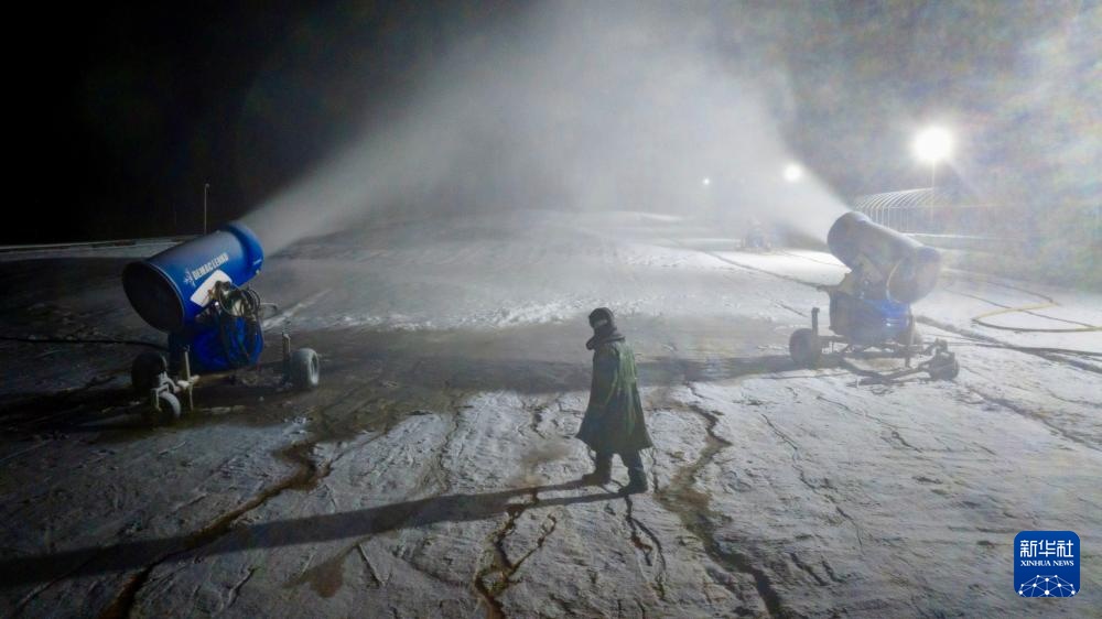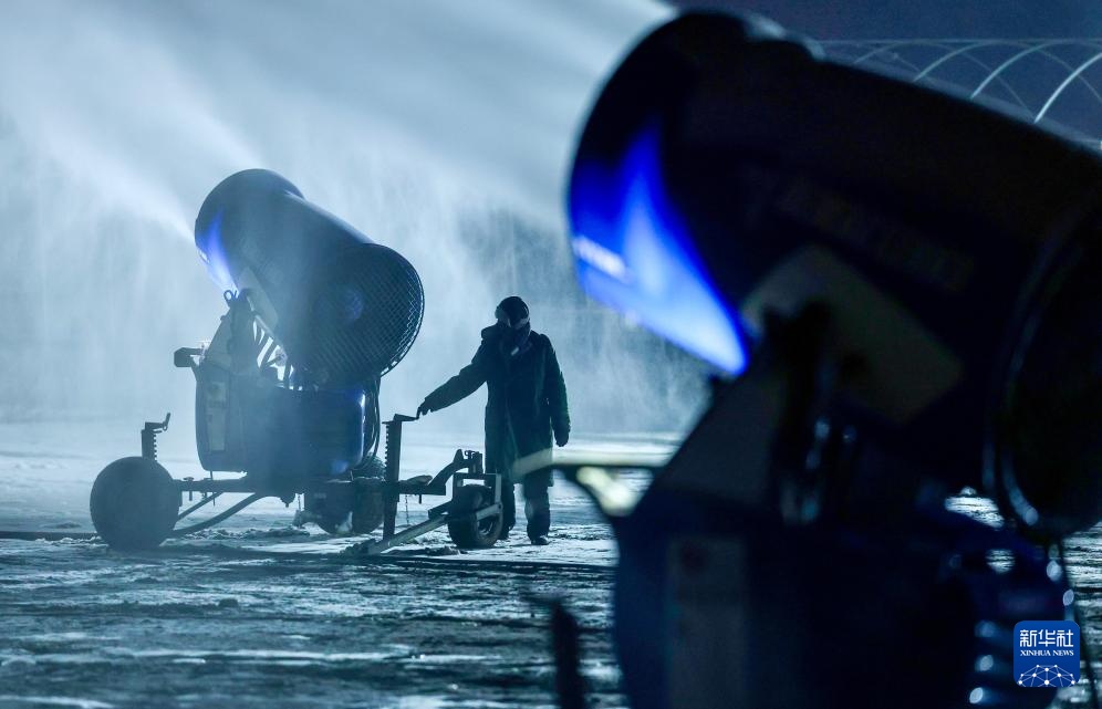 11月21日,工作人员在宁夏银川市阅海滑雪场进行造雪作业。