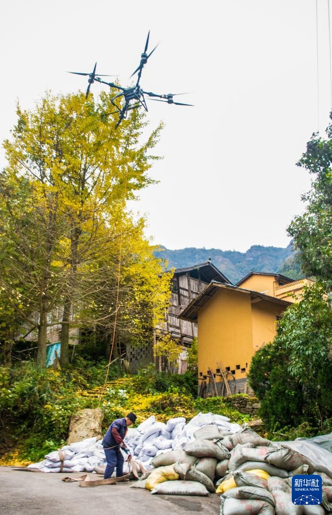 11月22日,重庆市石柱县中益乡的农民操作无人机为黄精地运送肥料。