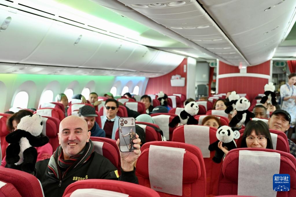 11月22日,在比利时布鲁塞尔国际机场,搭乘海南航空布鲁塞尔至重庆直飞航线首航航班的乘客在机舱内展示大熊猫玩偶。