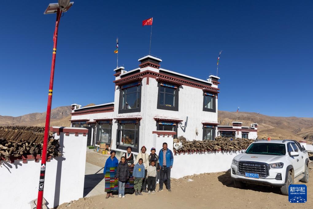 西藏定日县曲洛乡热木青村村民尼玛平措(右一)一家在新房和自家的汽车前拍照(11月12日摄)。