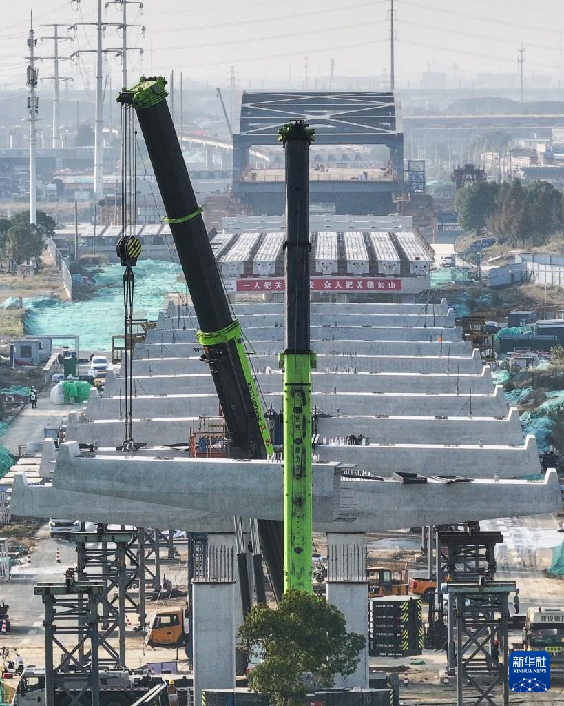 这是11月24日拍摄的312国道无锡凤翔路至广石路段工程11标架梁作业现场(无人机照片)。
