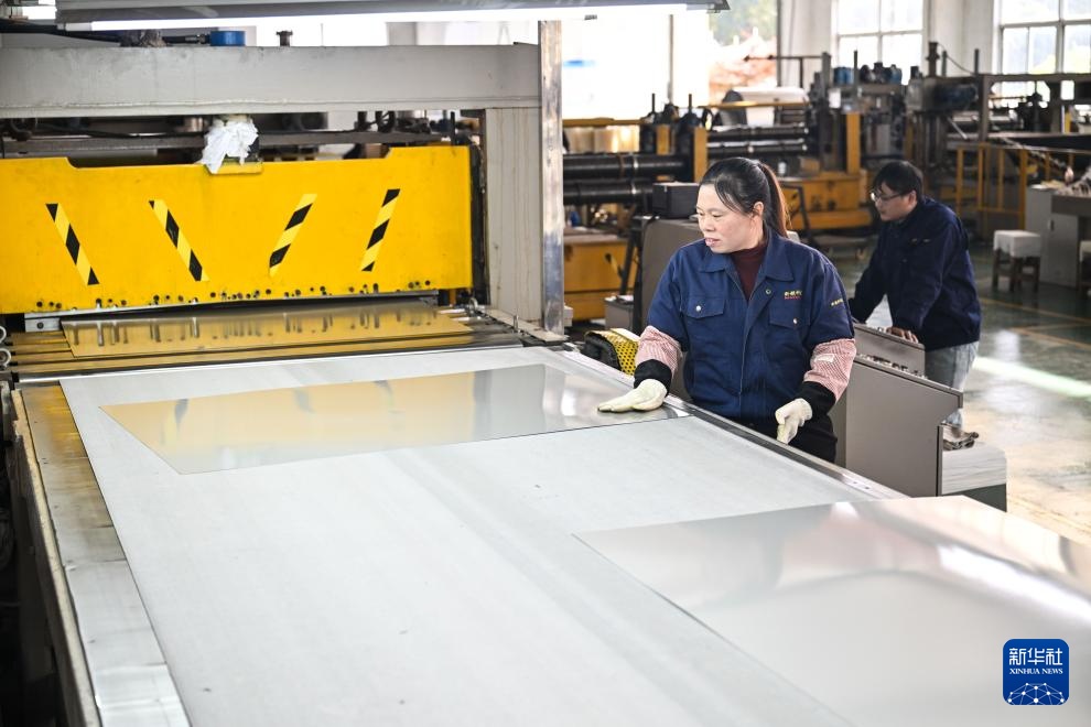 11月25日,在苏州新颖新材料科技股份有限公司,工人对冰箱面板成品进行质检。