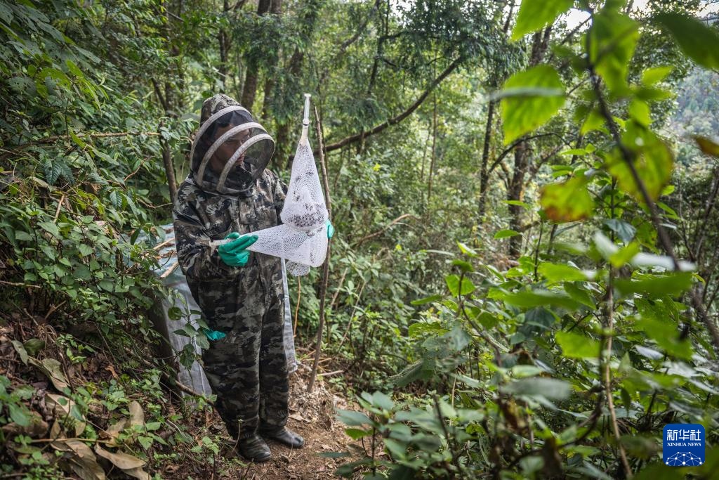 11月19日,在云南省保山市龙陵县龙山镇,黄氏蜂业有限公司工作人员在育蜂棚内辅助胡蜂人工交配。