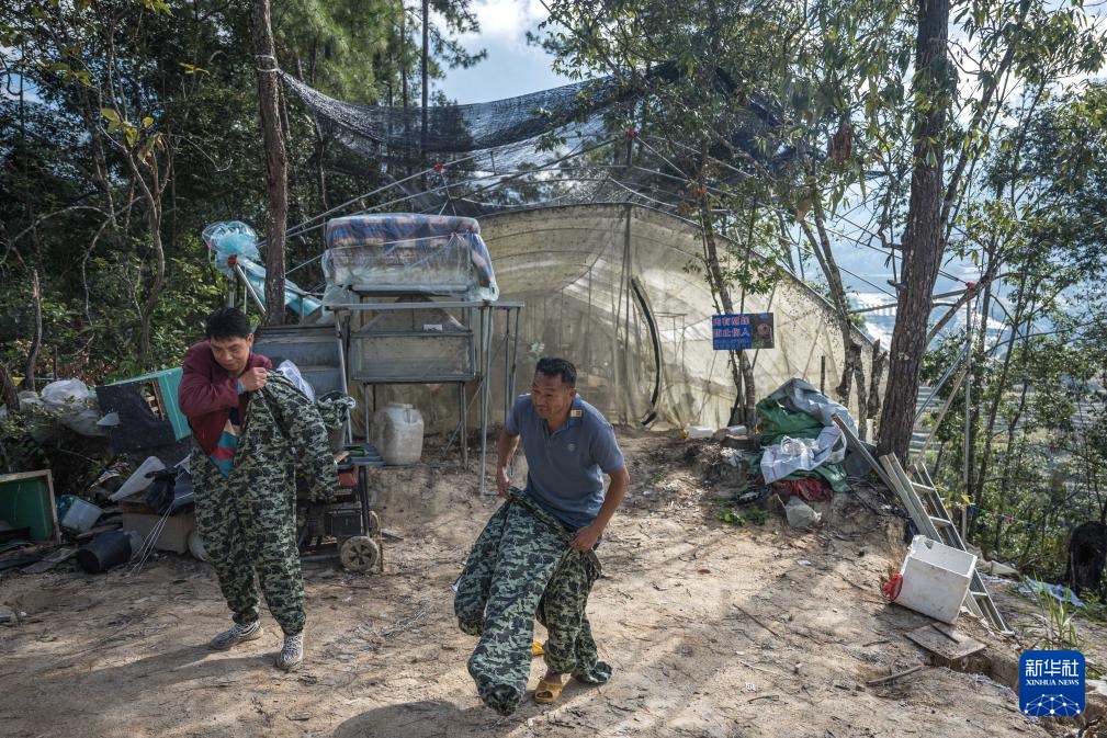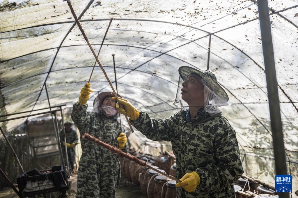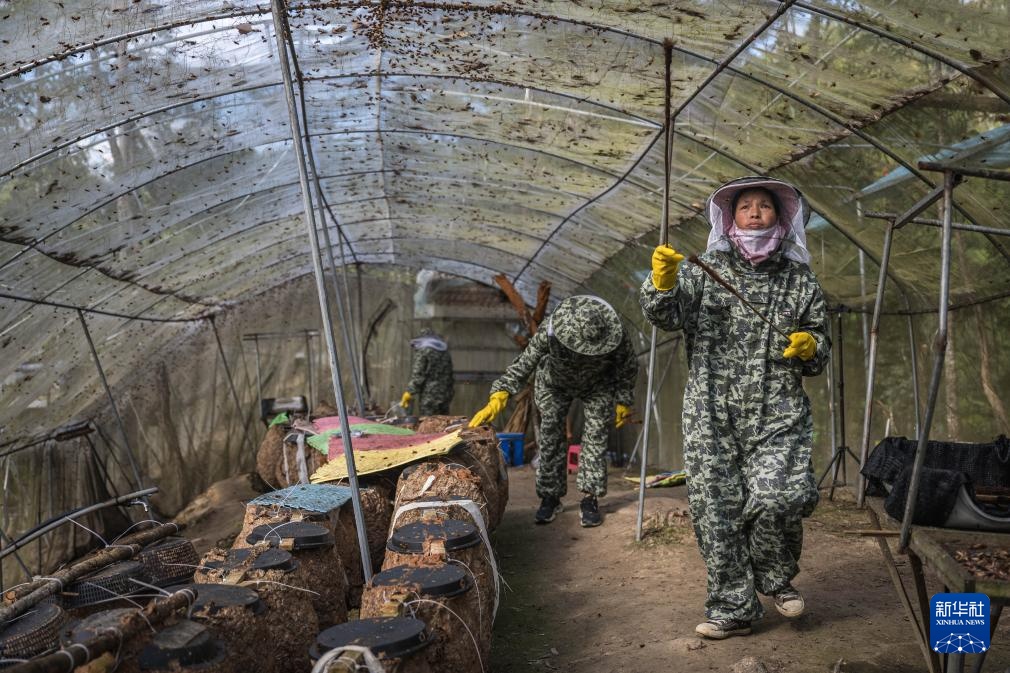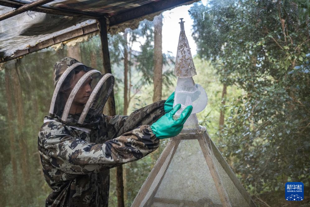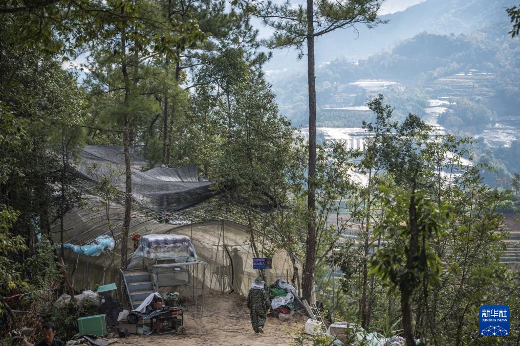 11月19日,在云南省保山市龙陵县龙山镇河头村,村民在养蜂棚内查看胡蜂。