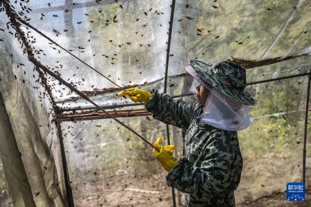 11月19日,在云南省保山市龙陵县龙山镇,黄氏蜂业有限公司工人在育蜂棚内辅助胡蜂人工交配。