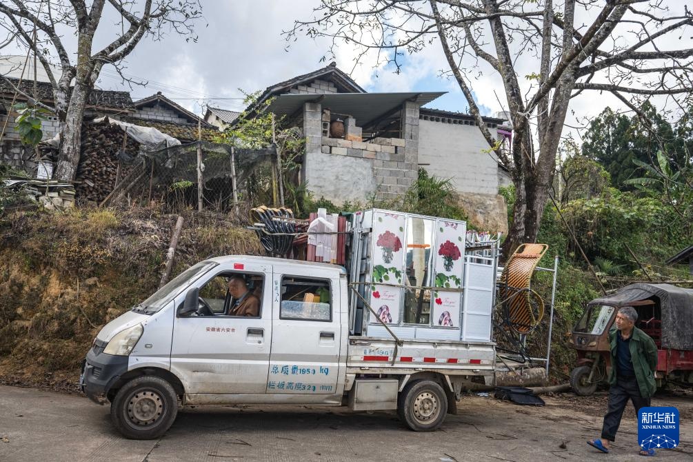 11月19日,商人在云南省保山市龙陵县龙山镇河头村收购旧家具,背景棚房处可见村民养殖的胡蜂。