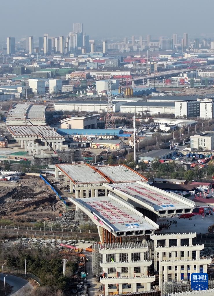 11月26日拍摄的兴港高速上跨津山铁路转体桥施工现场(无人机照片)。