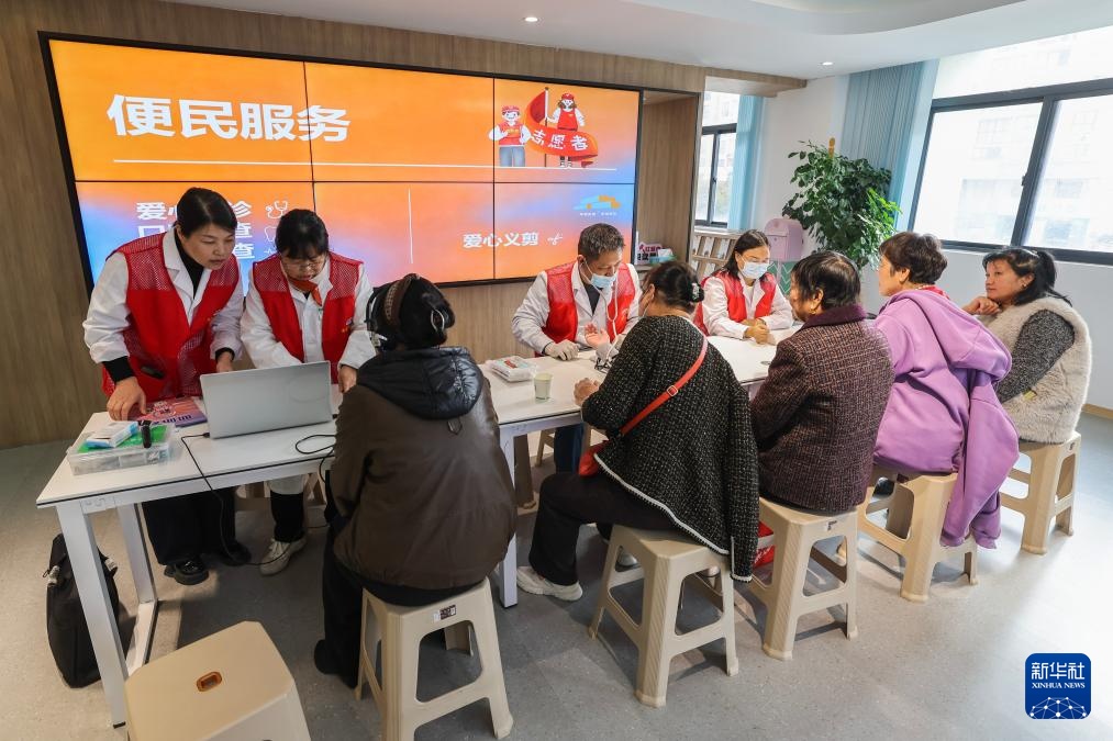 11月27日,在孝顺镇府东社区的党群服务中心,志愿者给社区老年人测量血压。