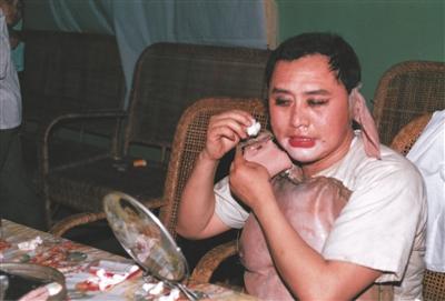 比化装还要恐怖的是“修装”。所谓修装,就是把半截面具从脸上掀起来,用酒精棉球把里面全擦干净,之后再拿刷子蘸上胶水,像刷墙一样用胶水把脸上刷匀。这还不算完,还必须要拿扇子把胶水扇得干一点,才能再安回脸上,修完一半的脸再修另一半。