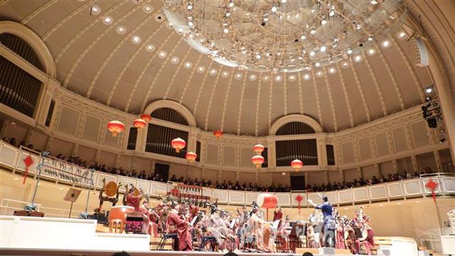 应美国芝加哥交响乐团、底特律交响乐团、马斯卡廷市政府邀请,湖北省演艺集团《编钟国乐》演出团一行40人与国家京剧院演出团联袂,赴美国芝加哥、底特律、马斯卡廷、圣地亚哥、橘子郡等地巡演。首场演出在芝加哥交响乐团音乐厅隆重举行,芝加哥交响乐团是美国五大交响乐团之一,芝加哥交响乐团音乐厅在音乐界享有盛誉。10日下午三时,剧场外瑞雪纷飞,音乐厅内特意悬挂大红灯笼,上半场为《编钟国乐》音乐会,下半场由国家京剧院于魁智、李胜素等京剧名家登台演出。我驻美大使崔天凯、我驻芝加哥总领馆代总领事刘军等出席观看。