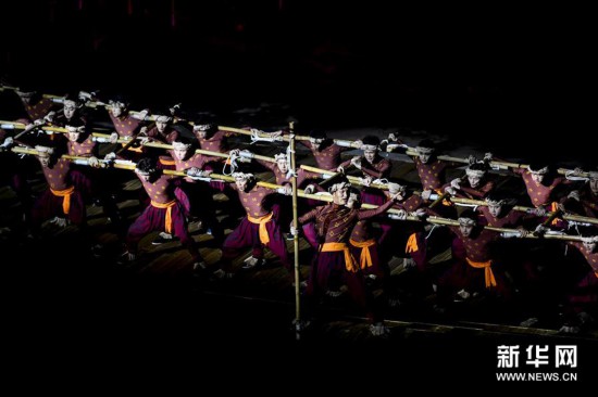 演员在《印象武隆》实景演出中表演(3月12日摄)。 3月12日晚,新版大型山水实景演出《印象武隆》在重庆武隆桃园大峡谷上演。为向观众呈现更佳的视觉效果,《印象武隆》剧场今年进行了灯光升级改造、表演调整优化。《印象武隆》大型山水实景演出以国家级非物质文化遗产“川江号子”为主线,展现巴蜀大地壮美的自然景观和独特的风土人情。自2012年在重庆武隆桃园大峡谷正式公演以来,《印象武隆》已累计演出2200多场,观众达350余万人次。 新华社记者 刘潺 摄