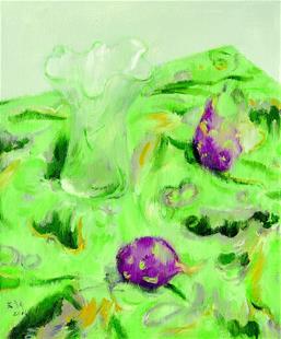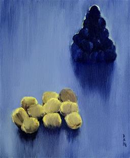 王文新的笔下,有鲜嫩的草莓、山楂、葡萄、青果子,也有糜烂的香蕉和梨、长了烂点的菜花。他在绘画中,寄寓着对生命的思考、对生活的热爱。