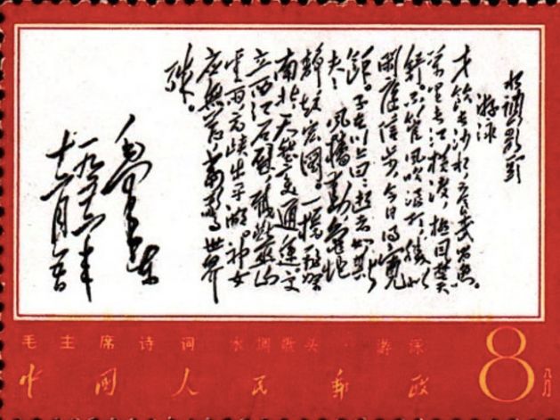 第13枚便是毛泽东1956年8月创作的《水调歌头·游泳》词的手书。这首词表现出征服大自然的伟大气魄,展现了新中国掀起的经济建设宏图。