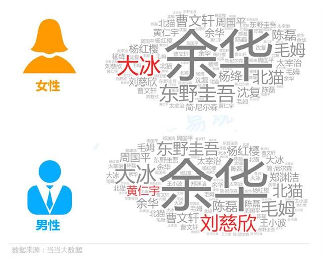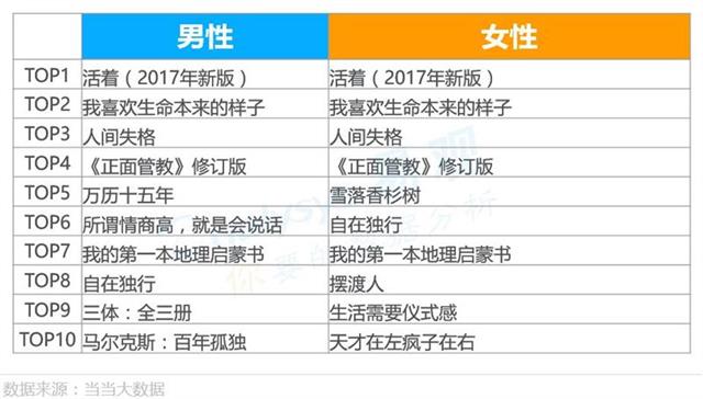 物质生活的提高,使得人们对精神生活的也提出了越来越高的要求。来自当当相关数据显示,2018年女性畅销书籍排行榜中,除了《活着》《人间失格》更大众喜爱畅销读物,女性对生活品质的专注有着强烈的内在需求,《生活需要仪式感》就是许多女性读者更偏爱的代表性图书。而最受男性欢迎的图书榜上,排名第6的《所谓情商高,就是会说话》反映出,男性越来越看重“情商”,看重“说话”的技巧。 在受欢迎作家榜中,中国作家余华、日本推理小说家东野圭吾、英国作家毛姆,成为国民最爱的作家。在男女更喜爱的作家差异性上,男性对刘慈欣,黄仁宇趋向更多。 不同年纪的人群阅读的书籍内容也大不相同,60后过了知天命的年纪,更加关心健康养生之道;70后正值壮年,则更关心社会的发展;80后大多已为人父母,对孩子的教育投注了许多心力,他们对儿童阅读,图画书购买得更集中。