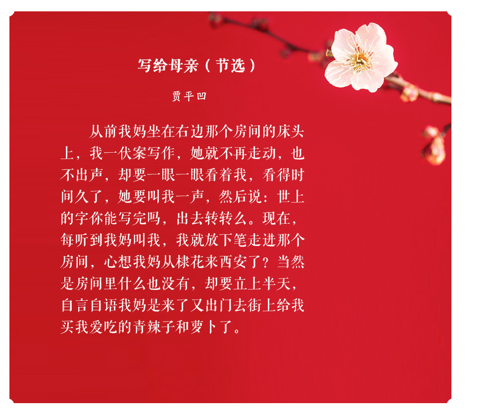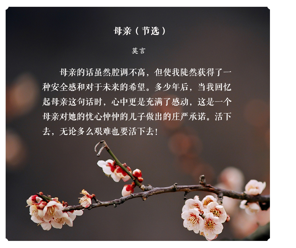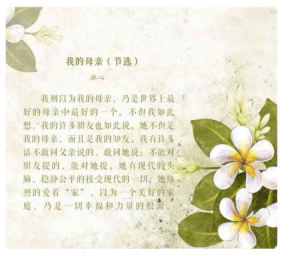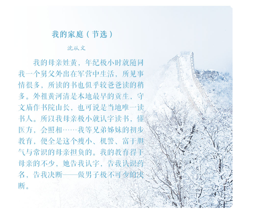 人们常说“严父慈母”,父爱总是如山般深厚内敛,而母爱则如水般细腻温柔。“临行密密缝,意恐迟迟归”,母亲从不用华丽的辞藻诉说她们的爱,而是默默将其融入生活的一点一滴;“月明闻杜宇,南北总关心”,一切远行的出发点总是与母亲告别,但儿行千里母担忧,我们从未离开过母亲的牵挂——孩子走到哪里,母亲的心就跟到哪里。然而母亲的伟大,不仅在于她给予我们生命和爱,更因她让我们从顽愚走向睿智,教会我们应以怎样的方式立身于天地之间。让我们一起走进老舍、沈从文等名家的回忆中,回望他们身后慈祥的母亲,感受动人的母爱。