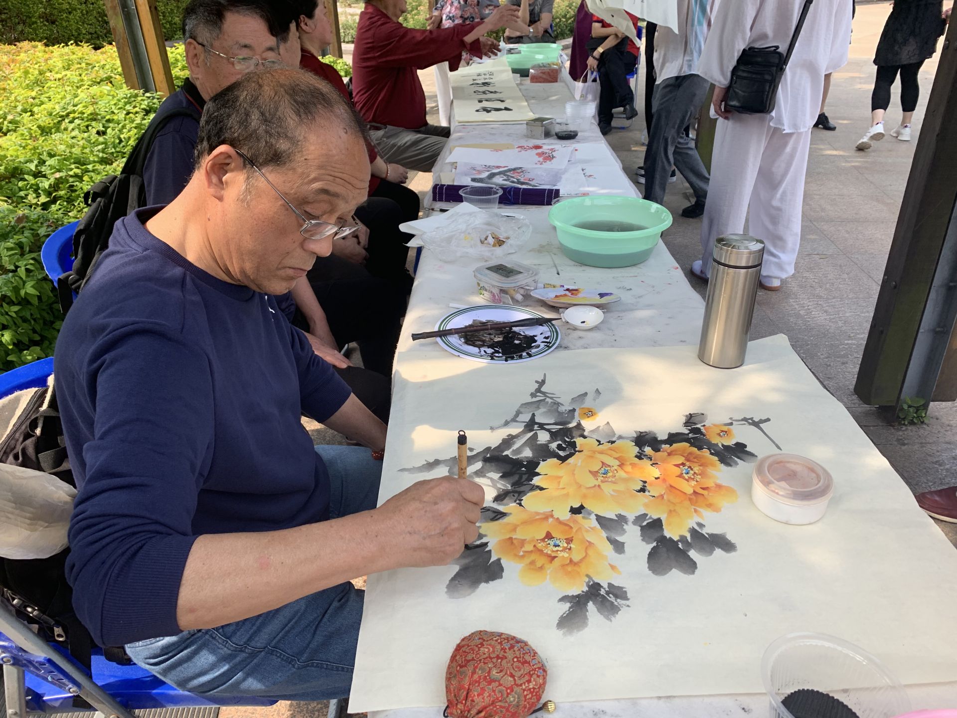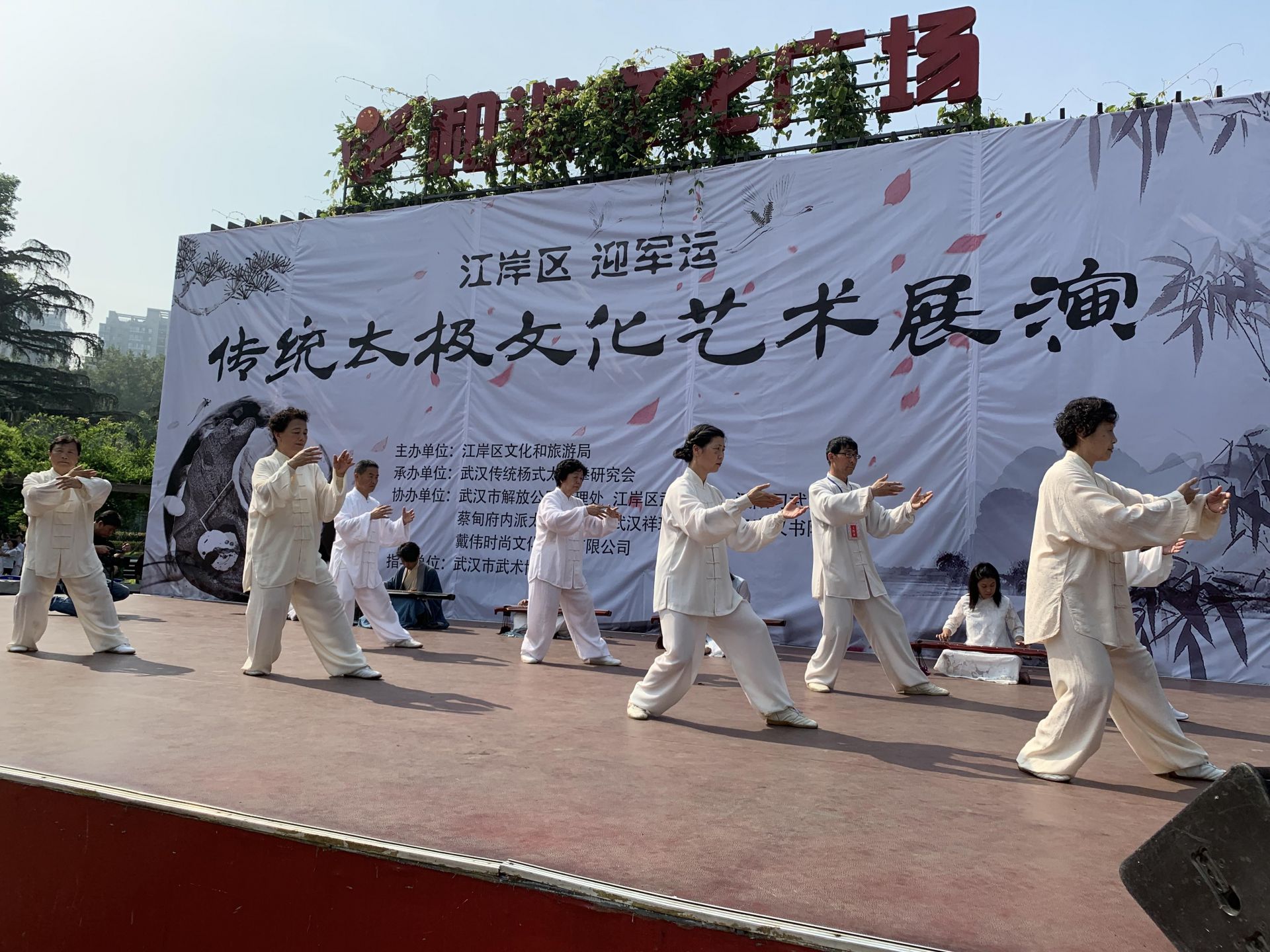 活动伊始,13名太极名家带领着台下的太极拳友们,进行了一场太极拳合演,整齐划一、招式优美、灵动传神。现场,八名古琴演奏家和乐弹奏,八位知名书画家挥毫泼墨,和太极拳表演相互呼应,吸引周边百余名居民观看,还有不少路过的太极拳爱好者主动加入到太极拳表演中。