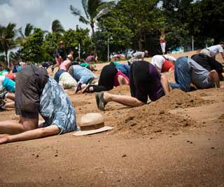 日前,澳大利亚环境保护组织用一张“一大群人将头埋在沙中“的图片引起了全球注意。该组织意图用这样的举动讽刺澳总理阿博特对气候变化的态度。(中国日报网)
