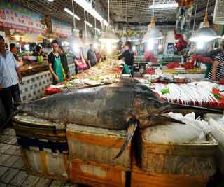昨日,一条3.06米长、412斤重的巨型“箭鱼王”,在青岛某菜市场引起市民围观。据悉,23日午夜,青岛渔民在黄海捕获了这条巨型箭鱼。(中新网)