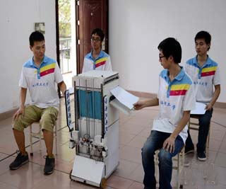 近日,江西理工大学四名大学生发明了一台“监考机器人”。据悉,机器人不仅可以对考生进行身份识别,还能自动收发试卷和防作弊。图为“监考机器人”模拟发放试卷。(中新网)