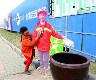 昨天去武汉宜家的市民惊奇地发现,在该商城的进出口,新摆放了4口土黄色齐膝高的大陶缸,每口缸边“站”着一位身穿黄马甲的纸板环卫女工,它左手捏着小广告,指着缸内(如图)。一旁的温馨提示语写着“小广告丢里面,文明看得见”。宜家一开业,旺盛的人气便引来了众多散发小广告者。昨天中午,记者在宜家门前看到,3个小时内,此缸“吃”进的小广告就占到整个容量的1/4。(武汉晨报)